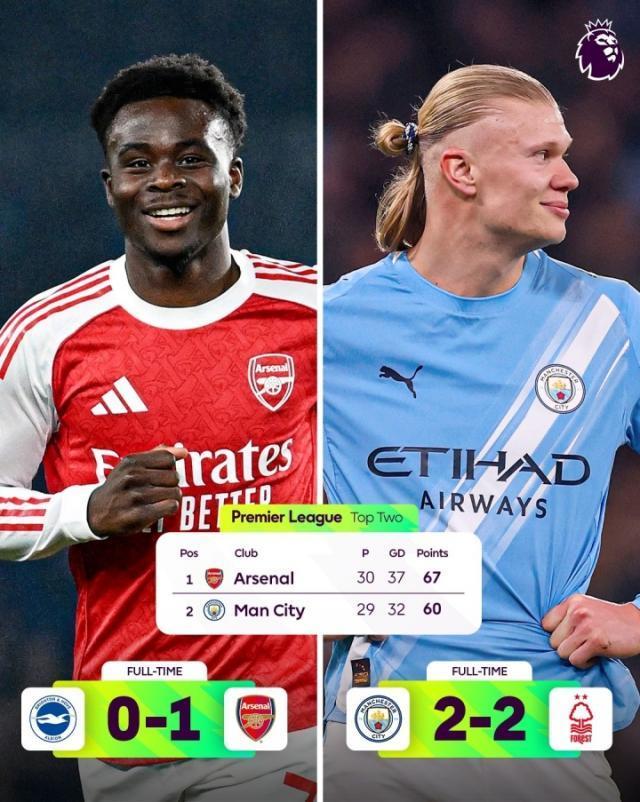 英超第29轮,志在争冠的曼城在保级队身上栽跟头,本轮被诺丁汉森林逼平送出关键积分。另一边,阿森纳虽踢得惊险,但还是成功战胜布莱顿,成功收下三分。此轮战罢,阿森纳以多赛一场、领先7分的优势强势领跑积分榜,争冠形势一片大好。反观曼城,手握控球和射门优势却迟迟无法终结比赛,到手的三分变一分,使得自己与榜首阿森纳的差距拉大。