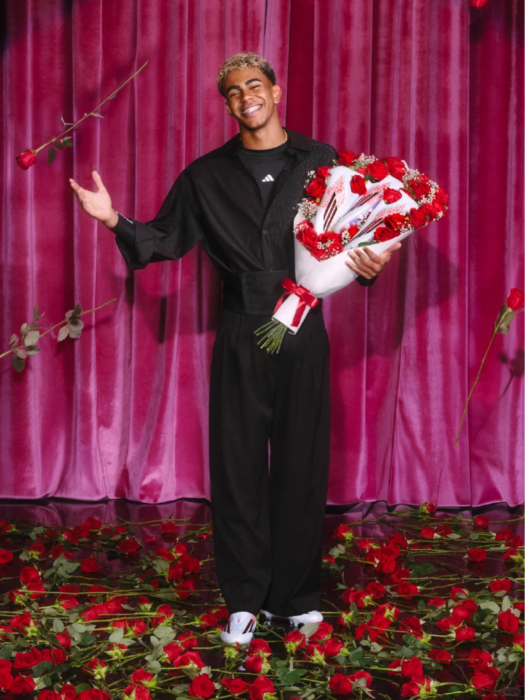 画面背景是粉红色的幕布,亚马尔整个人被一堆红色玫瑰花淹没,就剩一颗脑袋和两只穿着新球鞋的脚倔强地露在外面。